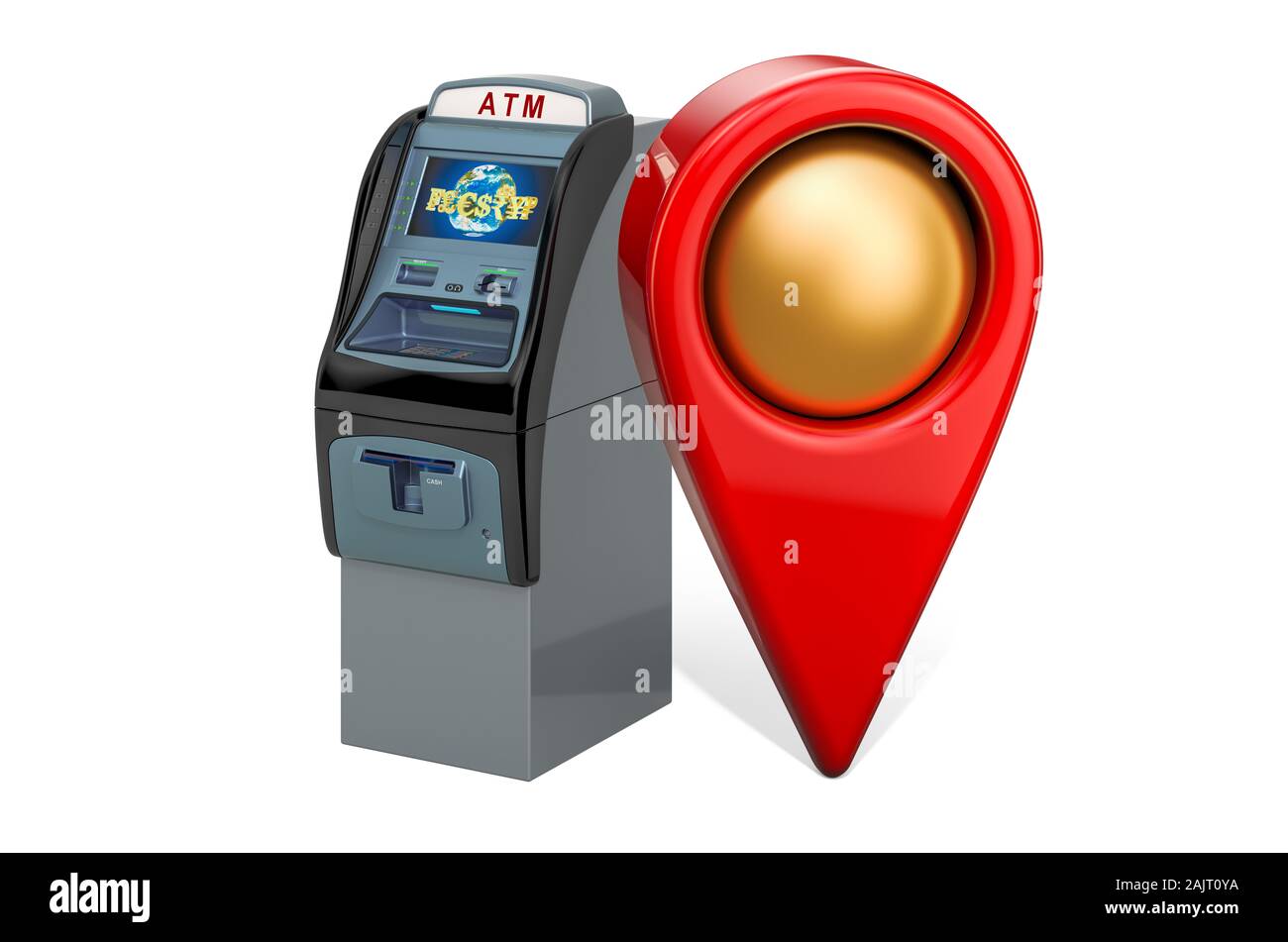 Map pointer with ATM machine. Cash machine location concept, 3D