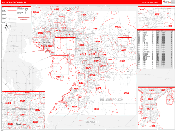 Hillsborough County, FL Zip Code Wall Map Red Line MarketMAPS